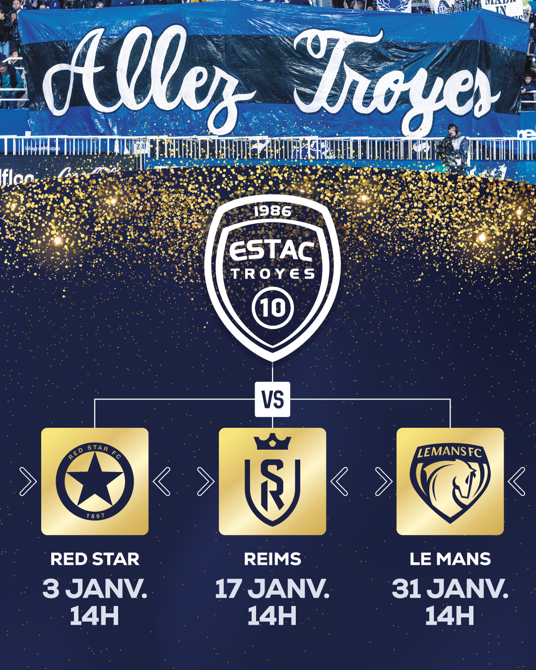 Le Stade de l’Aube s’apprête à vibrer dès les premiers jours de 2026. En janvier, l’ESTAC vous donne rendez-vous à trois reprises à domicile : trois matches, trois ambiances, trois occasions de pousser les Bleu & Blanc vers la victoire. Un premier coup d’envoi dès le 3 janvier, face au Red Star ! Supporters troyens, familles, groupes d’amis : on compte sur vous pour transformer le Stade de l’Aube en forteresse et démarrer l’année du bon pied. Vous pouvez toujours vous abonner pour la mi-saison et profitez de ces trois rencontres.