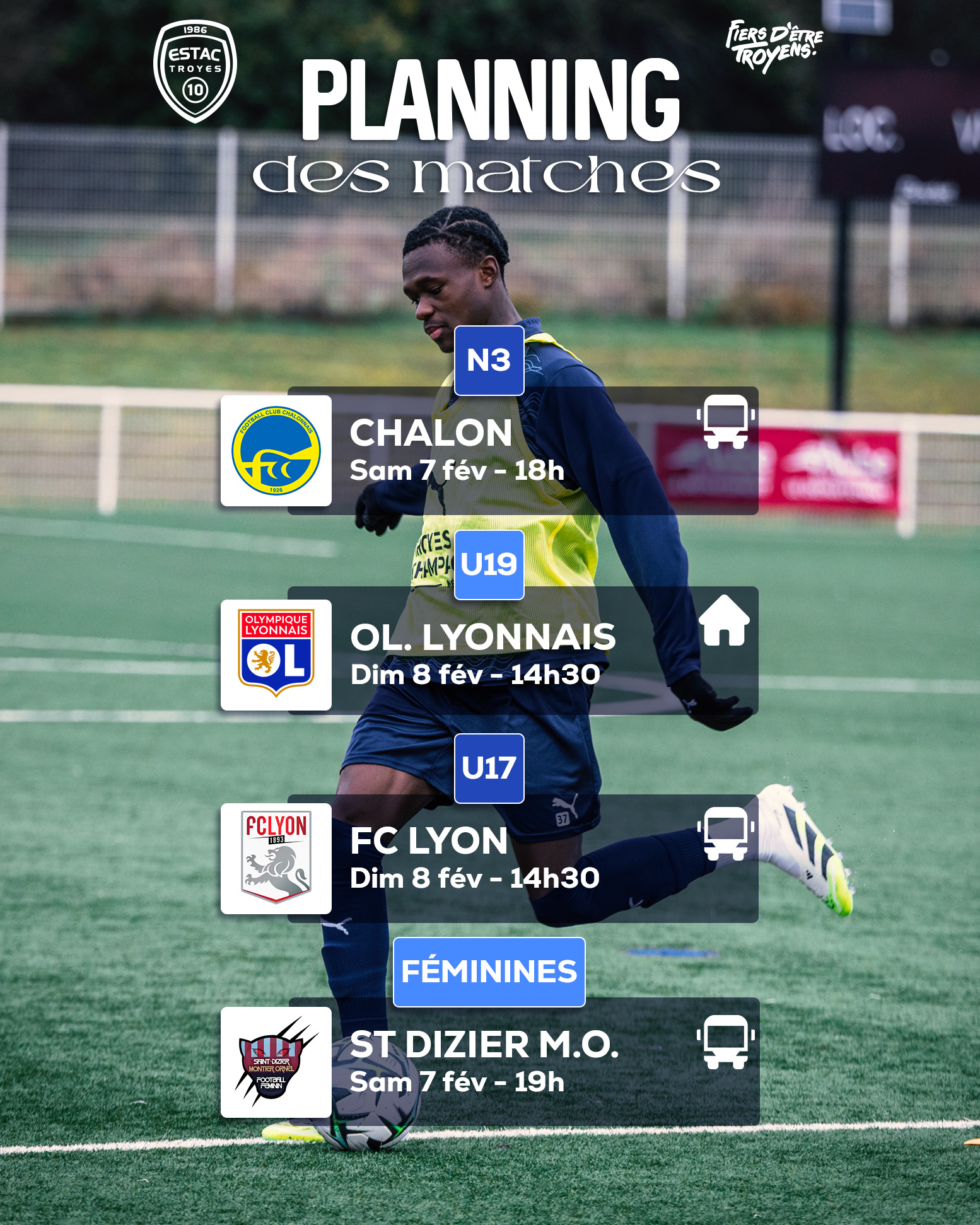 U19 N : ESTAC – Olympique Lyonnais (Dimanche 8 février, 14h30) – championnat (Complexe sportif de l’Aube 2)