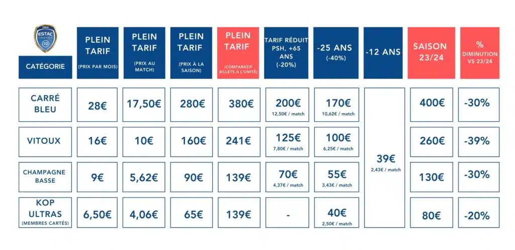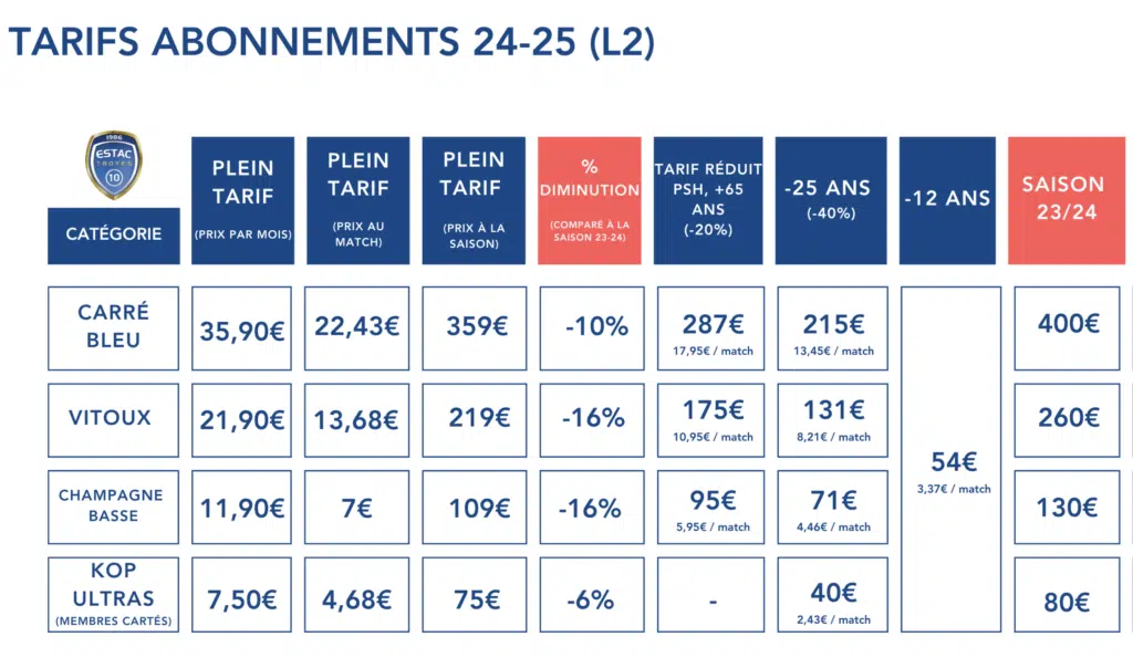 Une fois l’annonce officielle de son repêchage en Ligue 2 BKT, l’ESTAC a annoncé la prolongation des tarifs initialement présentés pour le championnat de National concernant les abonnements et réabonnements, jusqu’au 31 août inclus. Il vous reste ainsi 3 jours pour en profiter, avant un basculement vers les tarifs de Ligue 2 BKT pour le reste de cette saison 2024/2025.