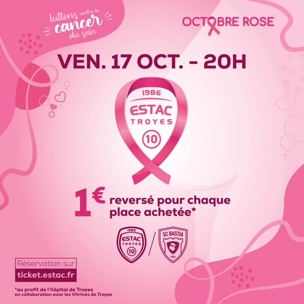 À l’occasion de la 10e journée de Ligue 2 BKT, l’ESTAC reçoit le SC Bastia ce vendredi 17 octobre à 20h au Stade de l’Aube. Ce match sera placé sous le signe de la solidarité et de la prévention dans le cadre d’Octobre Rose, le mois de mobilisation contre le cancer du sein. Tout savoir sur la rencontre :