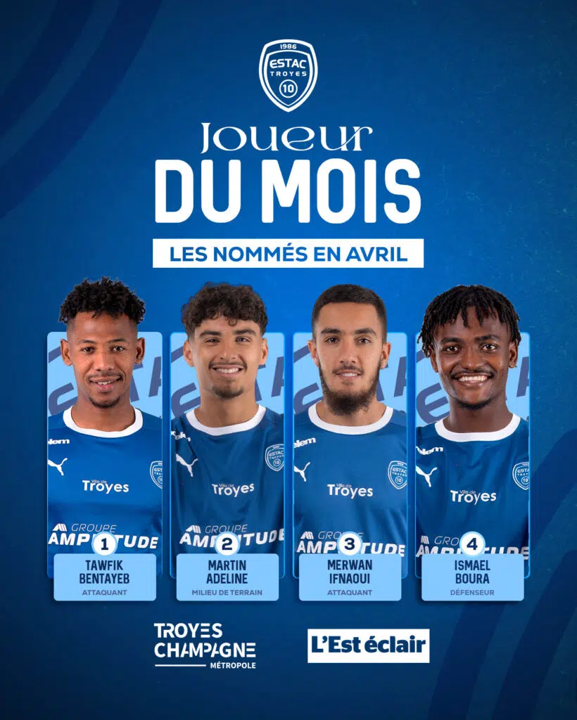 Supporters, il est temps de désigner le joueur troyen du mois d’avril, en collaboration avec Troyes Champagne Métropole et l’Est-Eclair !