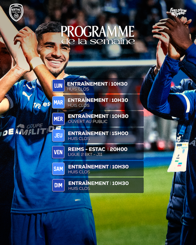 Après leur nouvelle victoire à domicile face à Bastia (1-0, J10), l’ESTAC reprend le chemin du travail et disputera le derby à Reims ce vendredi (20h00, J11). Découvrez le planning de la semaine pour nos Bleu et Blanc.