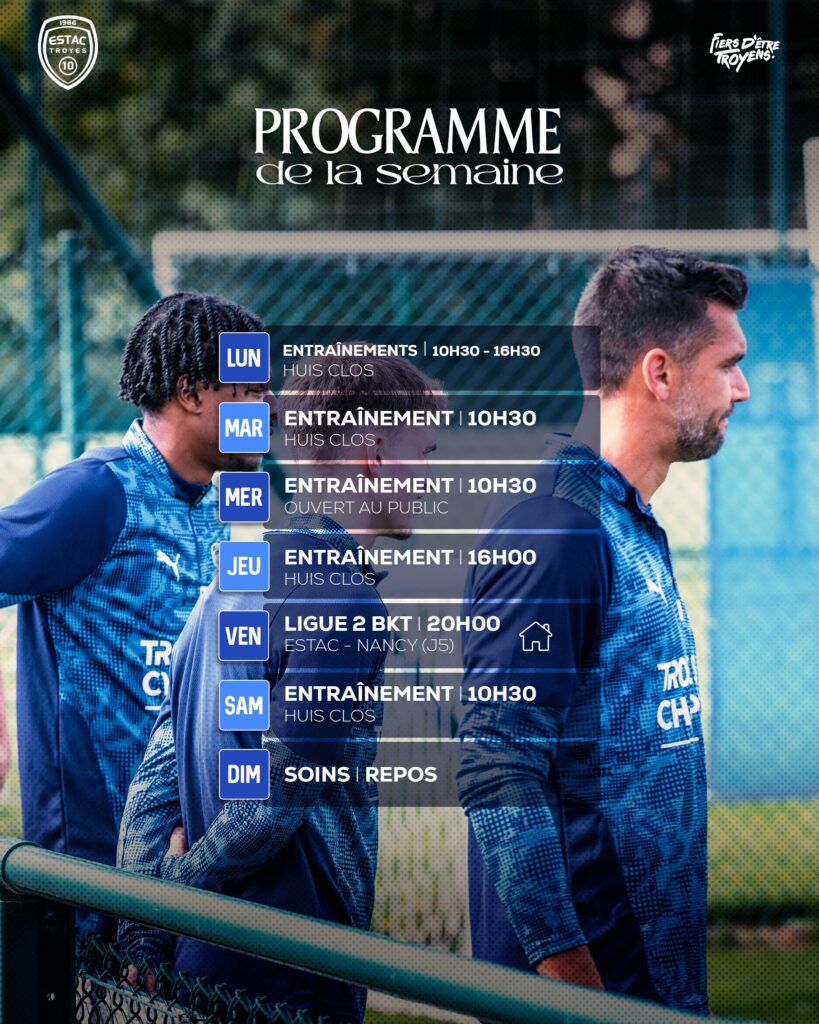 Retour à la compétition pour nos Bleu et Blanc, avec la réception de Nancy ce vendredi (J5, 20h00). L’entraînement du mercredi sera ouvert au public ! Nous avons hâte de vous retrouver au Stade de l’Aube ce vendredi. Découvrez ce qui est prévu pour cette rencontre spéciale 👉 ESTAC – ASNL (J5).